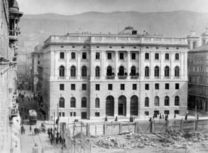 Nel 1911 la “Zivnotenska Banka” di Praga acquistò un lotto nel borgo teresiano per la costruzione di un’edificio destinato ad ospitare gli uffici della banca e alcune abitazioni. Il progetto fu elaborato dall’architetto Josef Costaperaria con la collaborazione del consigliere edile, l’architetto Osvaldo Polivka nel 1912 Nel 1956 l’immobile venne ceduto alla Banca d’America e d’Italia, che commissionò diversi lavori di modifica agli interni. In particolare, nel 1957 un progetto di modifica al primo piano comportò lo smantellamento della vetrata poligonale della sala d’aspetto. Nel 1977 un progetto di rinnovo dei locali del salone casse implicò lo smantellamento degli arredi originari e la sostituzione della scala di raccordo con il piano rialzato. Infine, nel 1986, la scala a chiocciola originale fu sostituita con una scala a tre rampe ortogonali. Dal 1995 l’immobile ospita una filiale della Deutsche Bank. L’edificio costituisce un esempio unico di architettura in cui si fondono le tecniche razionalistiche d’inizio Novecento con armonie di tardo gusto secessionista mitteleuropeo. Ai lati del portone d’ingresso sono presenti due statue bronzee raffiguranti l’industria e l’agricoltura, realizzate dagli scultori Ladislav Salun e Franta Anyz, autori anche del bronzo raffigurante la Navigazione, presente nel salone.. – Costaperaria Josef. Nato a Krapje Novska il 06.02.1876 e morto il 07.12.1951. Architetto. Dopo una prima formazione a Zagabria, fu allievo di Otto Wagner presso l’Accademia di belle arti di Vienna e collaborò a Gorizia con Max Fabiani. Trasferitosi a Trieste nel 1905, lavorò per il Consorzio di ingegneri costruttori e con Enrico Nordio. Insieme a Osvald Polivka realizzò la sede della Zivnostenska Banka, poi banca d’Italia e d’America, oggi sede della Deutsche Bank, via Roma 7 (1911-1914). Dopo la prima guerra mondiale fu capo architetto del tratto Maribor Logatec della ferrovia meridionale Vienna-Trieste e spostò la sua attività a Lubiana dove realizzò parecchi edifici. (da: biblioteche.comune.trieste.it/)